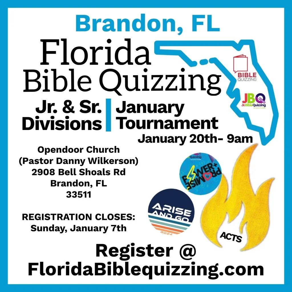 The 2024 Bible Quizzing season begins! Junior and Senior Bible Quizzers meet on JANUARY 20TH, 2023 AT 9:00 AM.